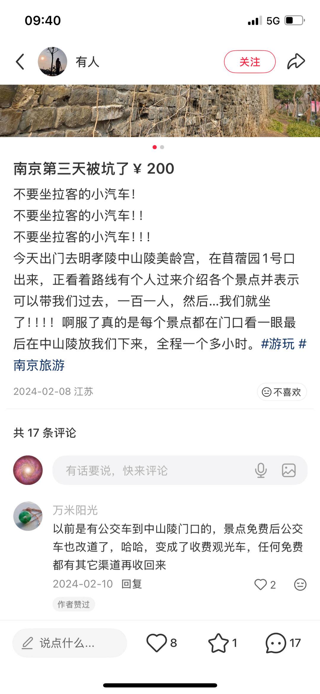 记者在小红书等酬酢平台检索发现,近期对于中山陵左近交通的投诉主要纠合在三方面:一是部分载客车辆漫天要价、不打表,三四公里路程报价大宗高于渊博运价;二是个别司机以“与景区息争”“免门票”“直达中枢景点”为噱头揽客,本色未推行本心,率领游客前去免费外围景点,且施展处事缺位;三是游客对景区限行范围、接驳阶梯不矜重,导致出行权略受阻。
